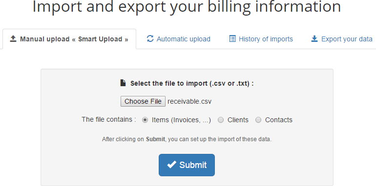 Select the file by clicking the button provided for this purpose and select « Items ». Then click the « Submit » button.
