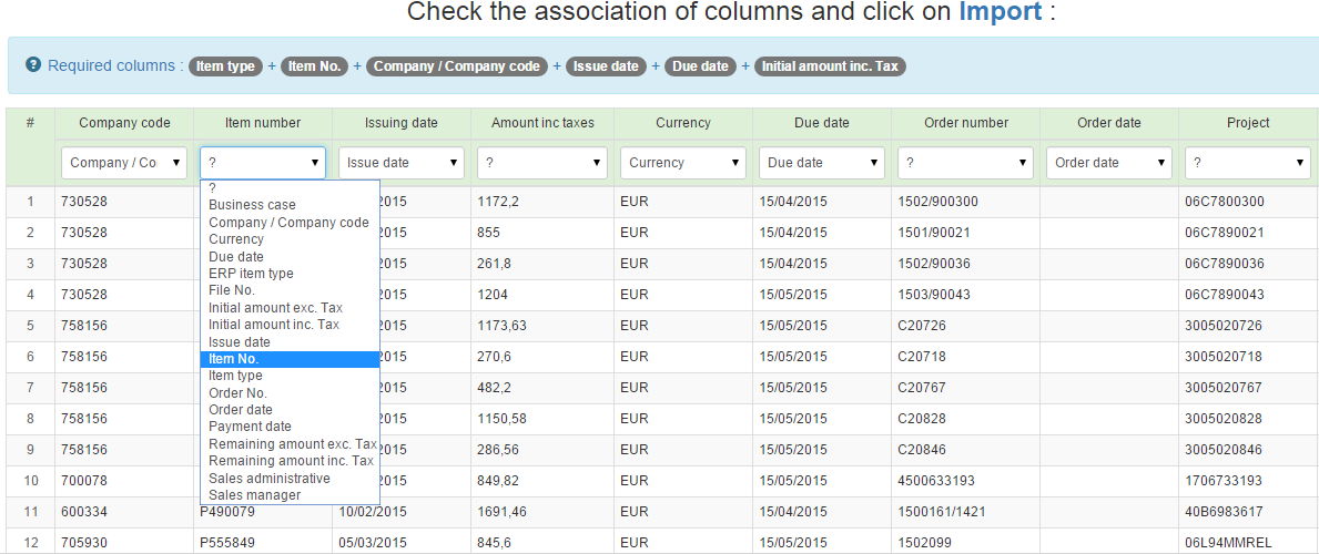 If your file has 2 columns, debit and credit (general ledger type), this format is also supported with the fields « Credit amount » and « Debit amount ». These 2 columns will replace the column « Initial amount inc. Tax »