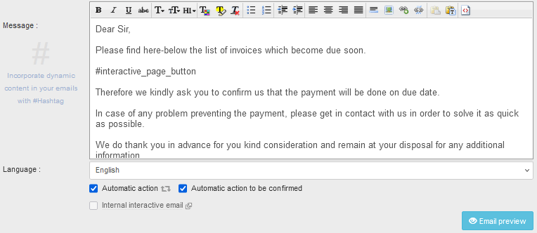 You can set some automatic dunning actions in My DSO Manager to maximize punctuality and effectiveness of your debt collection.