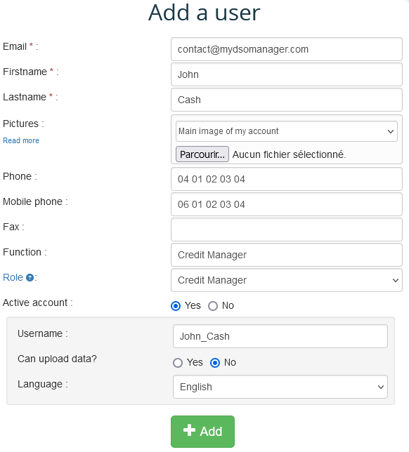 To create this type of user, from the relevant entity, go to Admin, Manage Users, and click « Add New User ».
