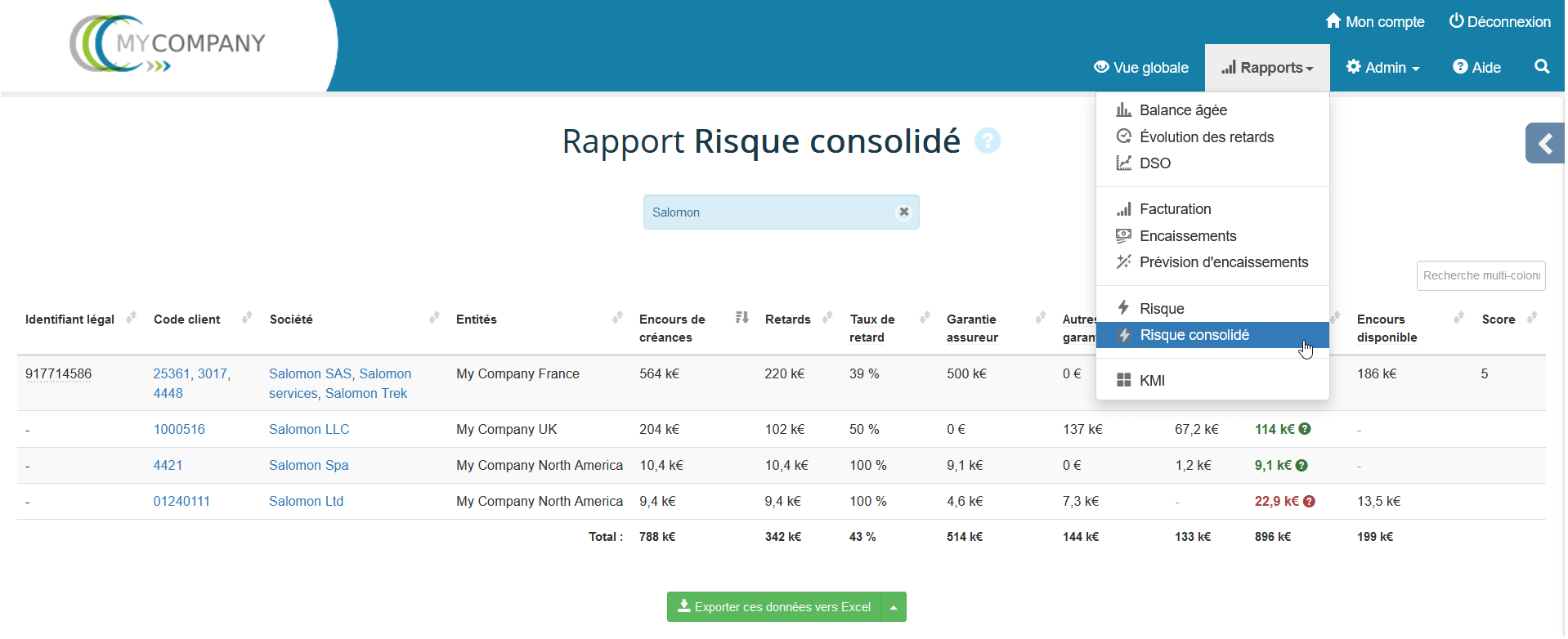 au niveau client, par entité juridique, ou code groupement pour les clients multi-entités. Suivi des montants d'assurance-crédit et autres garanties, des limites de crédit, des encours, des scoring internes et externes en quelques clics procurent une visibilité exhaustive et claire amenant des prises de positions et des décisions pertinentes.