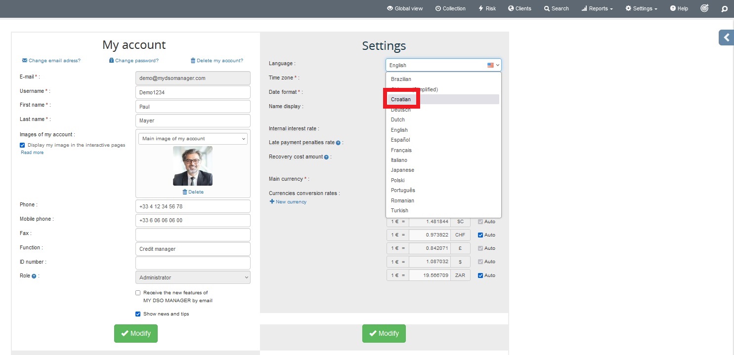 Cette intégration a été inspirée par la demande d'un client en Bosnie-Herzégovine, opérant dans l'industrie alimentaire et les équipements de nettoyage chimique. Le pays a trois langues officielles : bosniaque, serbe et croate. Pour répondre aux besoins multilingues de leur équipe de credit management, l'ajout du croate est devenu essentiel. Nous avons volontiers saisi cette opportunité pour améliorer leur expérience avec My DSO Manager.