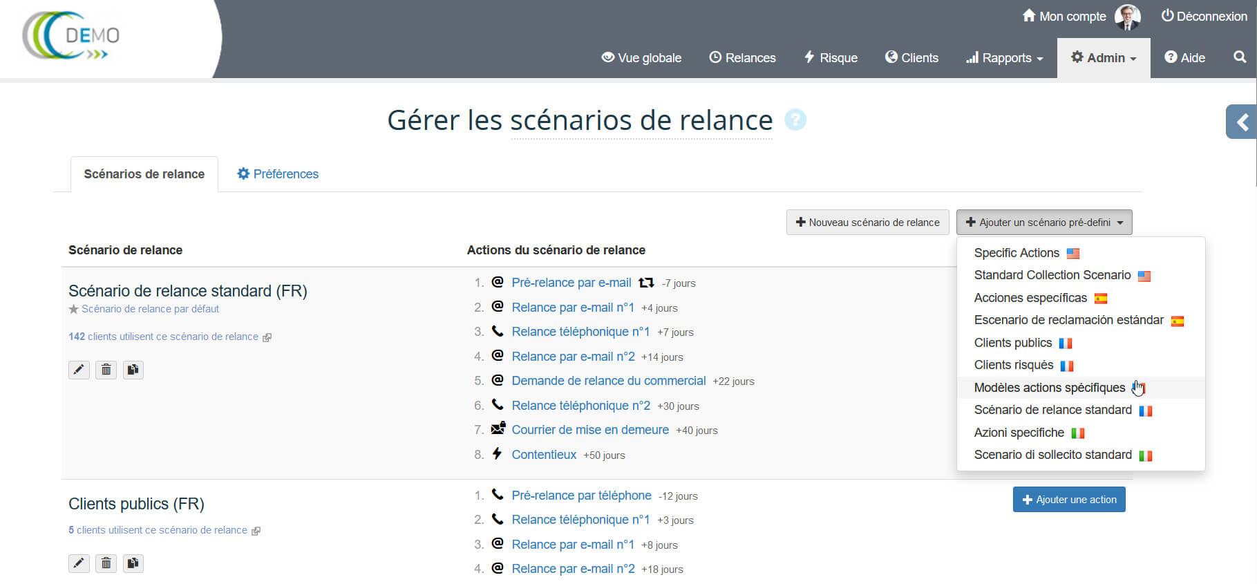 Nouveaux scénarios de relance prédéfinis en français, anglais, italien et espagnol ! Jeudi 20 Avril 2023 par My DSO Manager Retrouvez sur votre plateforme My DSO Manager nos nouveaux scénarios et modèles de documents de relance standard en Français , Anglais , Italien et Espagnol . Ils comprennent des modèles d'e-mails ; interactifs bien sur ; de lettres recommandées électroniques (LRE), de courriers transformant vos relances en outils de communication et de marketing favorisant l'image de marque de votre entreprise tout en améliorant la trésorerie.. Ils sont bien sur 100% personnalisables donc n'hésitez pas à les utiliser comme base pour les adapter selon vos besoins. Pour les ajouter à votre compte, dirigez-vous dans l'Admin / Gérer les scénarios de relance et cliquez sur "Ajouter un scénario pré-défini" :