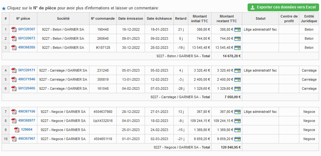 Cette balise affiche un état de compte consolidé mais regroupé par compte client avec un sous-total par compte : Etat de compte groupé Cet état de compte facilite la lecture de la comptabilité fournisseurs qui va recevoir votre relance et lui permettre de vous faire un retour adapté.