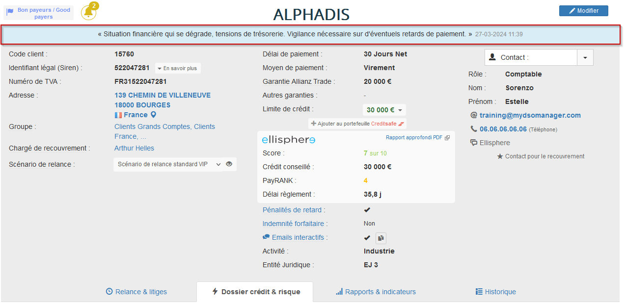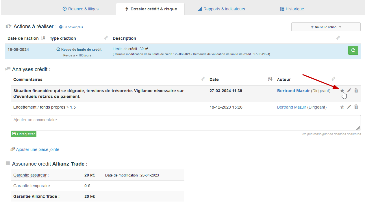 Vos commentaires clés d'analyse crédit sur la fiche client ! Mardi 26 Mars 2024 par My DSO Manager Vous souhaitez faire apparaître des commentaires clés d'analyse crédit sur la fiche client ? Il suffit pour cela de cliquer sur la petite étoile à côté de votre commentaire dans l'onglet Dossier crédit & risque : Le commentaire est désormais en gras afin de le distinguer des autres. Cette mise à jour permettra par exemple de prendre connaissance d'une situation financière présentant un risque d'impayé avant toute prise de décision. Votre commentaire est également affiché tout en haut de la fiche client. Cela le rend immédiatement visible pour tous les utilisateurs qui se connecteront sur ce compte client : Il est possible de sélectionner plusieurs commentaires à afficher. Vous pourrez ainsi faire remonter les commentaires les plus pertinents à votre équipe.Cette fonctionnalité est mise en place pour faciliter l'analyse d'un credit manager ou directeur financier devant valider, ou pas, une limite de crédit. En un clin d'œil, l'essentiel des informations sur l'évolution de la situation d'une entreprise est accessible aux décideurs. Ils pourront alors arbitrer bien plus rapidement et sur la base d'informations complètes et exhaustives : La situation actuelle du compte client : retards ? Litiges en cours ? etc. Les informations financières et comportementales en provenance d'un fournisseur d'informations financières. L'historique sur votre plateforme : profil payeur et son évolution sur les derniers mois, indicateurs de performance (DSO, taux de recouvrement, prévisionnel d'encaissements, etc.). Le montant des garanties en provenance d'un assureur crédit ou autres (garanties bancaires, garanties maison mère, etc.). le scoring et les analyses crédit effectuées en interne. Grâce à la centralisation des données en temps réel sur votre plateforme My DSO Manager, les décisions crédit peuvent être prises rapidement. De plus, elles se basent sur des informations complètes et qualitatives. Allier qualité et efficacité est incontournable dans un monde où tout va toujours plus vite. D'autant qu'il y a toujours davantage de volume de clients à gérer et à piloter.