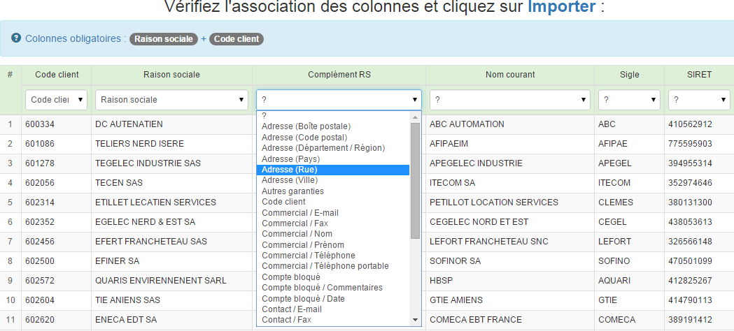 quelles sont les informations présentes dans votre fichier en affectant chaque colonne à un champ présent dans l'application.