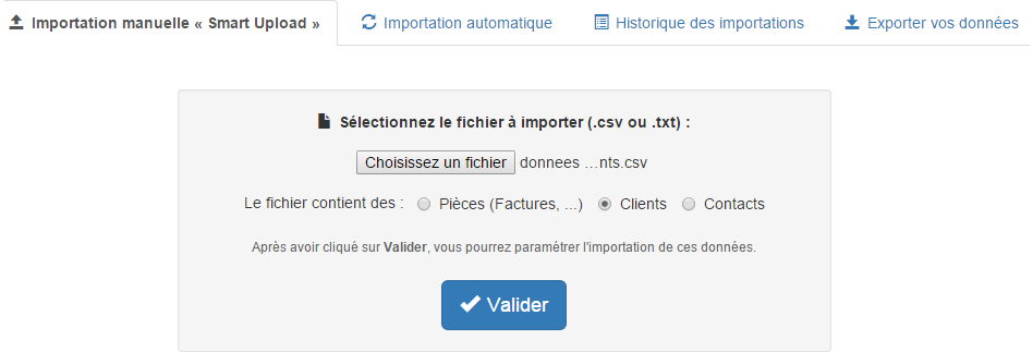 Choisissez le fichier en cliquant sur le bouton prévu à cet effet puis sélectionnez « Clients ». Cliquez ensuite sur le bouton « Valider ».