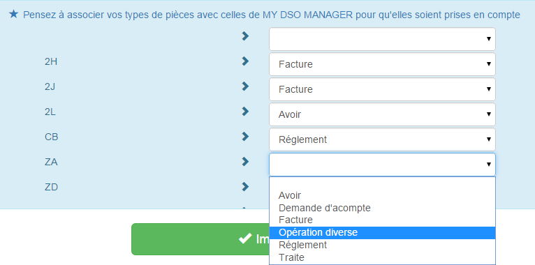 Il est nécessaire d'associer les types de pièces de votre outil comptable à ceux de