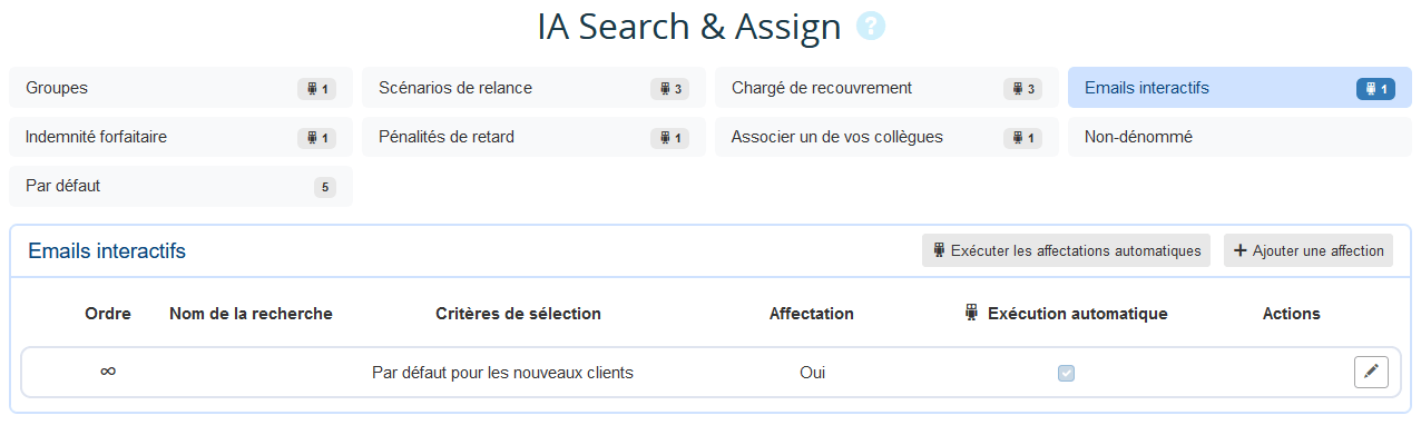 La relance interactive sera activée pour tout nouveau client selon les tâches d'affectations automatiques définies ou, si aucune affectation n'est appliquée, celui par défaut.