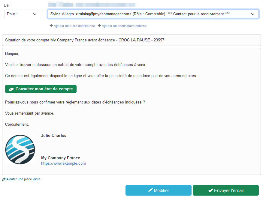 permet à vos clients d'accéder directement à leur situation de compte via un lien intégré dans vos emails de relance. Cette fonctionnalité facilite la communication et optimise le suivi des comptes clients.