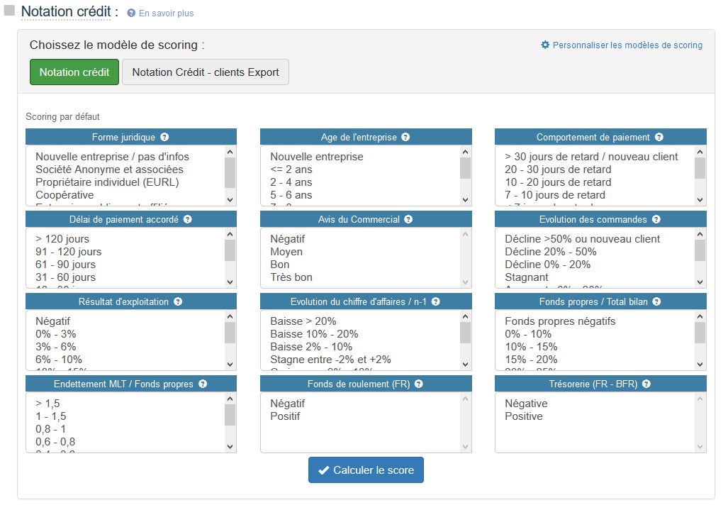 Vous pouvez choisir le modèle de scoring, qui est personnalisable depuis l'onglet Admin,