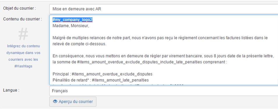 correspondante, ici #my_company_logo2, afin d'intégrer le logo dans le corps du courrier :