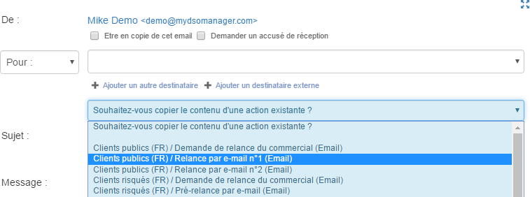 Une fois l'action souhaitée choisie, vous pouvez récupérer le contenu d'une action déjà existante, la modifier à vos souhaits puis l'envoyer.