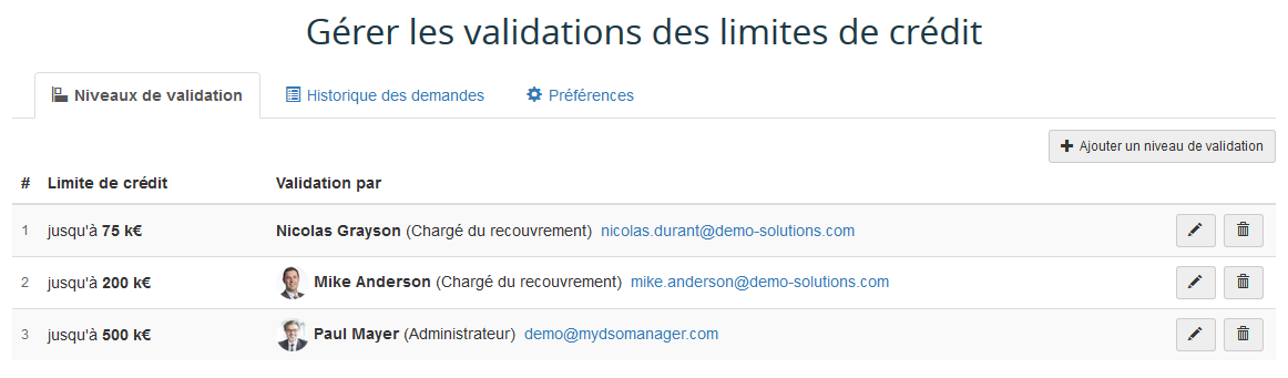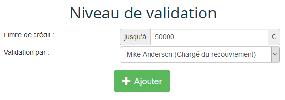 → Définissez un niveau de validation des limites de crédit par exemple à « 99 999 999 » pour donner à un valideur un niveau illimité.