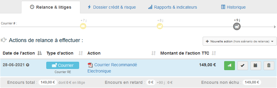 Vous retrouvez dans l'historique des relances l'action réalisée ainsi que le