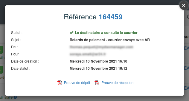 Dès l'envoi réalisé, votre destinataire et vous-même recevez un email indiquant les références d'envoi et confirmant l'expédition du Courrier RE.