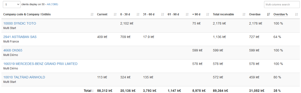 New in Multi reports! Wednesday, September 8 2021 by My DSO Manager In order to always improve your performance, your Credit Management software My DSO Manager is constantly evolving. Today, we focus on some reports of the Multi-Entity platforms, that allow to consolidate accounts receivable of the companies that compose your Group. Now you can have a more detailed view on some reports: Aging balance reportIn addition to having your aging balance by entity, it's now possible to display the detail by customer: This allows to display the list of your customers with outstanding amounts, due or not due (total, +240 days, ...), at Group level. The report is sorted by default in descending order of overdue: Risk report A new tab, Clients, is available in the Risk report. By selecting the tab, you can display the list of your buyers: ► Customers are grouped by legal identifier in order to have a consolidated view of the risk. The detail is therefore finer than at the level of the Ultimate Parent Number which, for the same group, can consolidate the information of many legal identifiers. Consolidated risk reportThe consolidated risk report provides with an exhaustive view of the risk at the level of an Ultimate Parent Number. Click on Show all to display all of your Ultimate Parent Number and get details: ► See more: What is the Ultimate Parent Number? Contact us to active this option on your Multi-entity platform. This is free of charge! Contact us