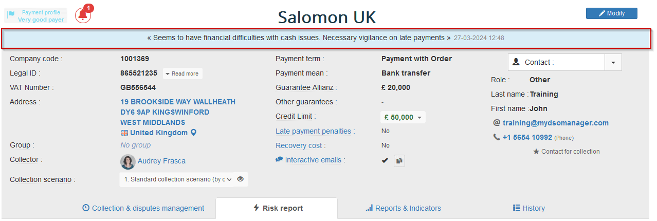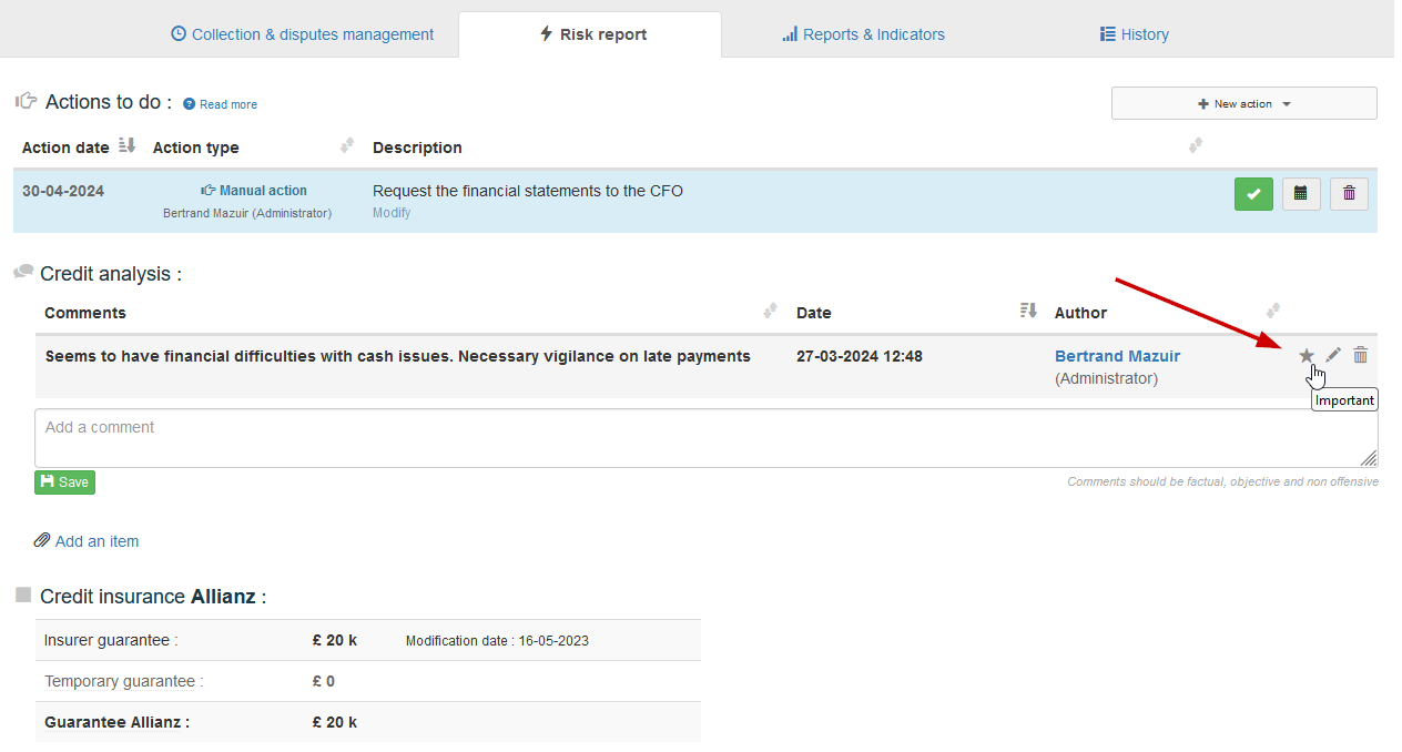Display key comments from credit analysis on customer file! Tuesday, March 26 2024 by My DSO Manager Do you want to display key comments from credit analysis on the customer file? To do this, simply click on the little star next to your comment in the Risk report tab: The comment is now in bold to distinguish it from others. This will also display the comment at the top of the customer file. This makes it immediately visible to all users who connect to this customer account: You also have the possibility to select and highlight several comments if needed.This makes easier for credit manager or financial directors to validate, or not, a credit limit during their analysis. Immediately, most of the information on the evolution of a company's situation is accessible to decision-makers. It enables them to make decisions quickly and on the basis of complete and exhaustive information: Current customer account situation: delays? Ongoing disputes? etc. Financial and behavioral information from a financial information provider. History on your platform: payer profile and its evolution over the last few months, performance indicators (DSO, recovery rate, cash forecast, credit report, etc.). Amount of guarantees from a credit insurer or others (bank guarantees, parent company guarantees, etc.). Scoring and credit analyses carried out internally. Thanks to the centralization of real-time data on their My DSO Manager platform, credit managers make quicker decisions. They also base them on complete and qualitative information. Combining quality and efficiency is essential in a world where everything is moving ever faster. Even more when there is an ever-increasing volume of customers to manage.