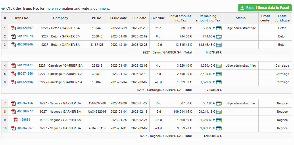 Grouped collection: use the dedicated #Hashtag! (Wednesday, January 31 2024) Wednesday, January 31 2024 by My DSO Manager Do you have several accounts for the same customer whose accounting is centralized? My DSO Manager allows you to group collection of several accounts in order to perform one action instead of several, and thus streamline communication with your customers. In order to make the account statements sent even more relevant, you can use the new #Hashtag #items_list_collection_grouped_splitted. This tag displays a consolidated statement of account but split by customer account with a subtotal by account: This account statement makes it easier to payable accounting to read your reminder and allows them to give you an appropriate return. Adding other tags to your email will also display other information such as total overdue, #items_amount_overdue, or total outstanding with #items_amount. Please note that this #Hashtag must be activated on your platform. Contact us if you want to use it. Find in the online help the list of available #Hashtags. Recovery is above all a problem of communication: communicating the right information, to the right people and at the right time is a key element of success. Thanks to the multiple customization possibilities, My DSO Manager allows you to implement extremely qualitative automated or semi-automated communication!