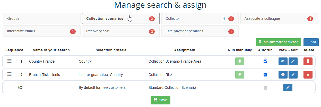 How to assign automatically collection scenarios with Search & Assign AI? Monday, April 29 2024 by My DSO Manager To reach optimum performance and to confirm your company's credibility with your customers, it is recommended to adapt your scenarios according to your customer type and your recovery strategy. With this tip, we will take a look at how to set up automatic assignment of collection scenarios and the required vigilance. Before starting, let's check the two below points: Scenarios you want to apply are created How to create or modify a collection scenario? The search to realize assignment are created too Customize and save your searches in My DSO Manager! Let's imagine our client portfolio is composed of English and French customers, and among these, some are not covered by your insurer's guarantee The language of scenario must be adapted for your French customers, as your collection strategy for the customers which match with the « Risk » criteria. Our scenarios and search are already created, let's manage assignment! Go to Settings, Manage Search & Assign: Select "Scenario" attribute and click on + Add. In Pop-up window, make the settings: Our assignments are created and appear in the order in which they were created: If you change the order, don't forget to save! This order is not insignificant, as it will correspond to the order in which the assignments are executed. Assignment behaviour differs depending on whether the execution is automatic, i.e. grouped, or manual, i.e. executed individually. For further information: Manage Search & Assign This tip presents a simple example of the possibilities of automatic assignment! This functionality will enable you to carry out the simplest to the most complex assignments: adapting your scenarios according to your customer's payer profile or risk level, for example.