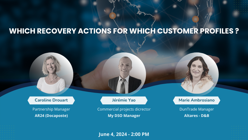Upcoming webinar with Altares and AR24 : Which recovery actions for which customer profiles ? Friday, May 10 2024 by My DSO Manager In an increasingly connected environment, what are the most effective collection strategies to implement based on the profile of your customers? This is the question that our experts, as well as those from Altares and AR24, asked themselves. This June 4, 2024, we invite you to attend this captivating webinar where you will discover how to reduce your DSO thanks to a fully digitalized journey. In this way, you combine payer profile information with electronic notifications, all integrated into credit management software! I book my place!