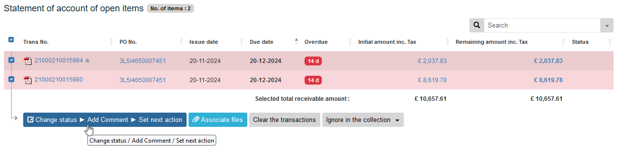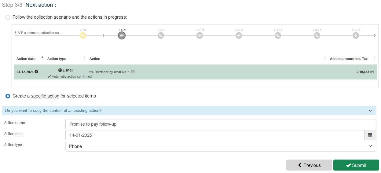 to perform a more appropriate reminder and exclude the selected items from the reminder scenario (for example, a payment promise follow-up action as shown below)