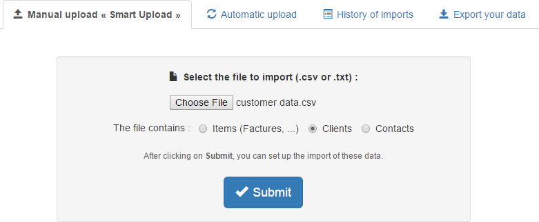 Select the file by clicking the button provided for this purpose and select « Customers ». Then click the « Submit » button.