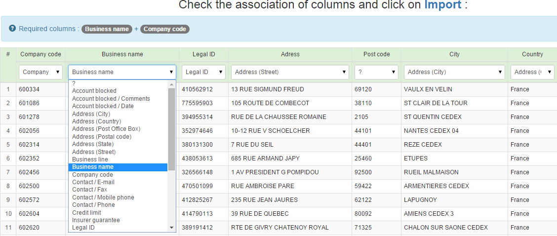The first time you import, it is necessary to indicate to My DSO Manager what is the information in your file by assigning to each column a field present in the application.