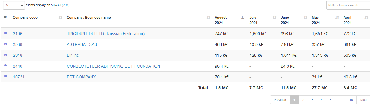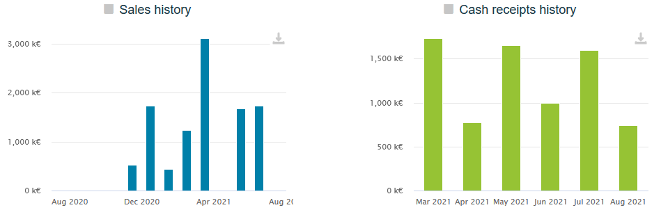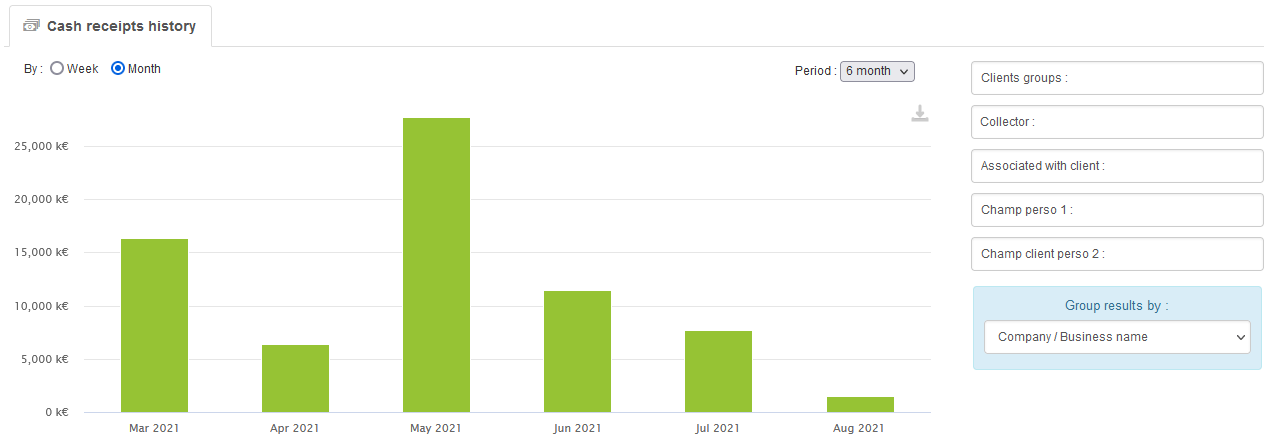 The Cash receipts report allows to follow the trend of payments received from customers. It is possible to look at it through several perimeters (customers groups, collector, sales manager...).